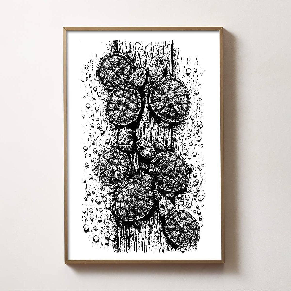 Our print of baby turtles on a log is printed on 11"x9" print. It is printed on matte finish 175 gsm fine art paper.