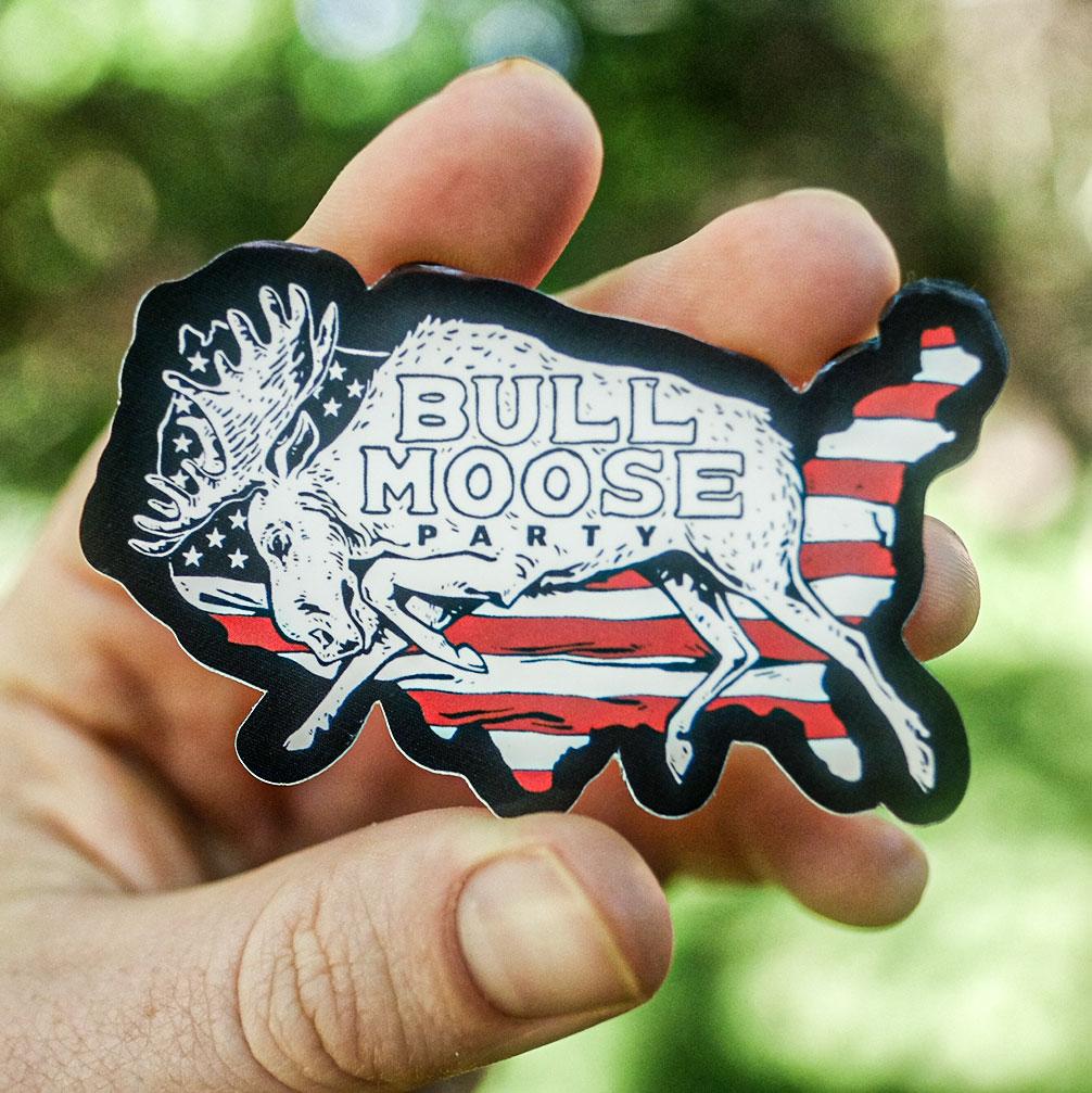 3"x2" screen printed, vinyl sticker of our Bull Moose Party design.