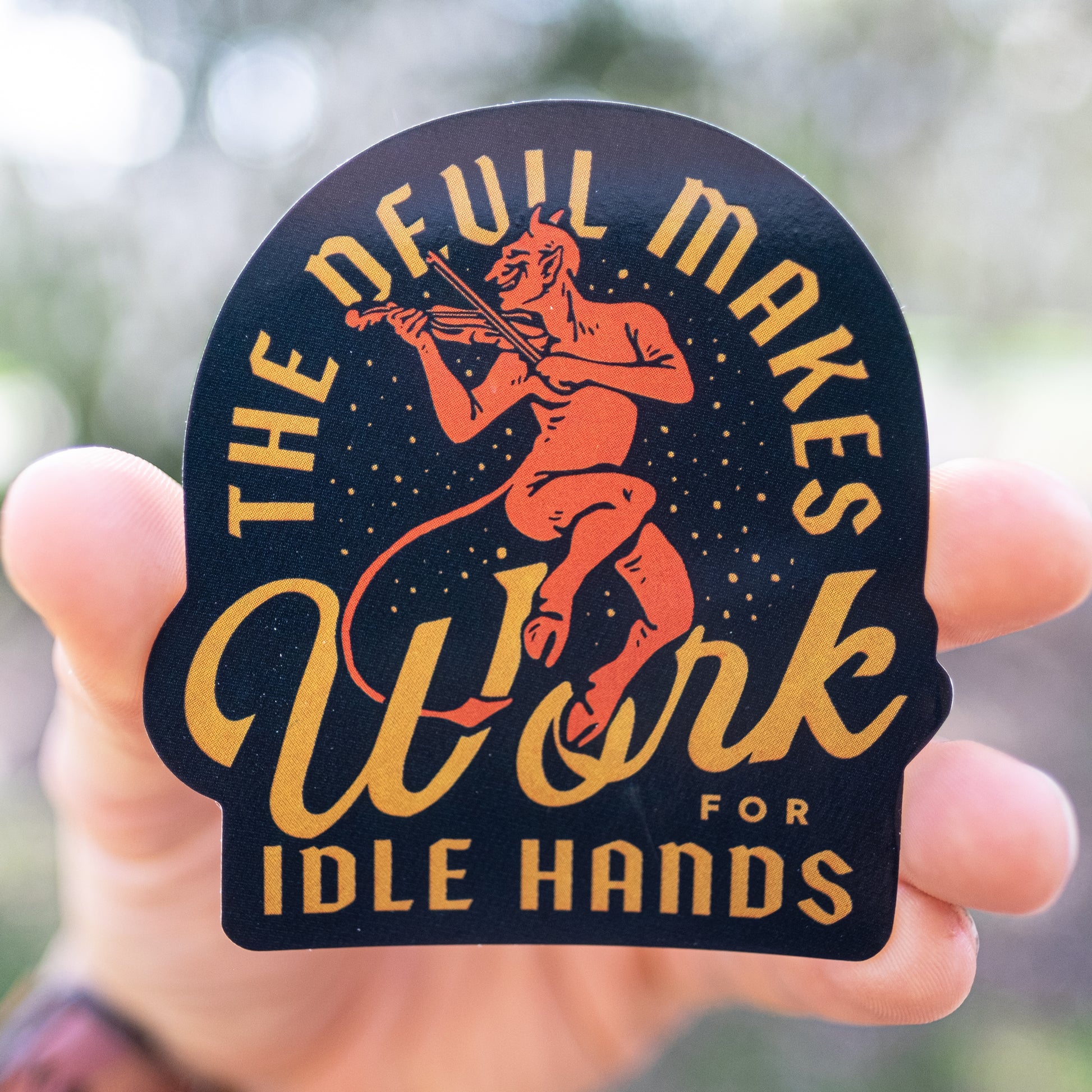 3"x3.25" screen printed, vinyl sticker of our devil's work design.