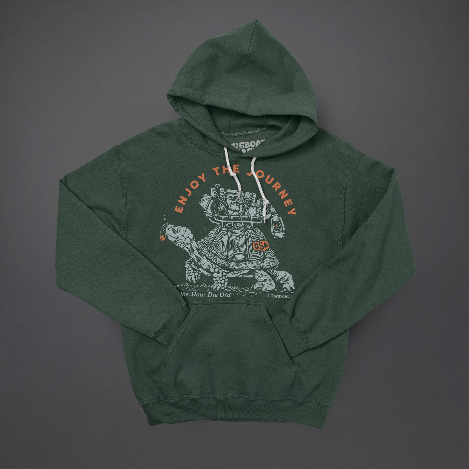 Printed on lighter-weight super-soft forest green hoodies (80/20 cotton/polyester).