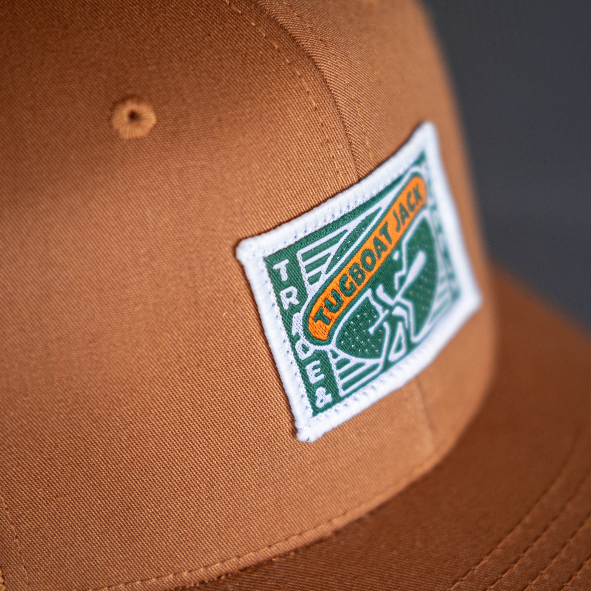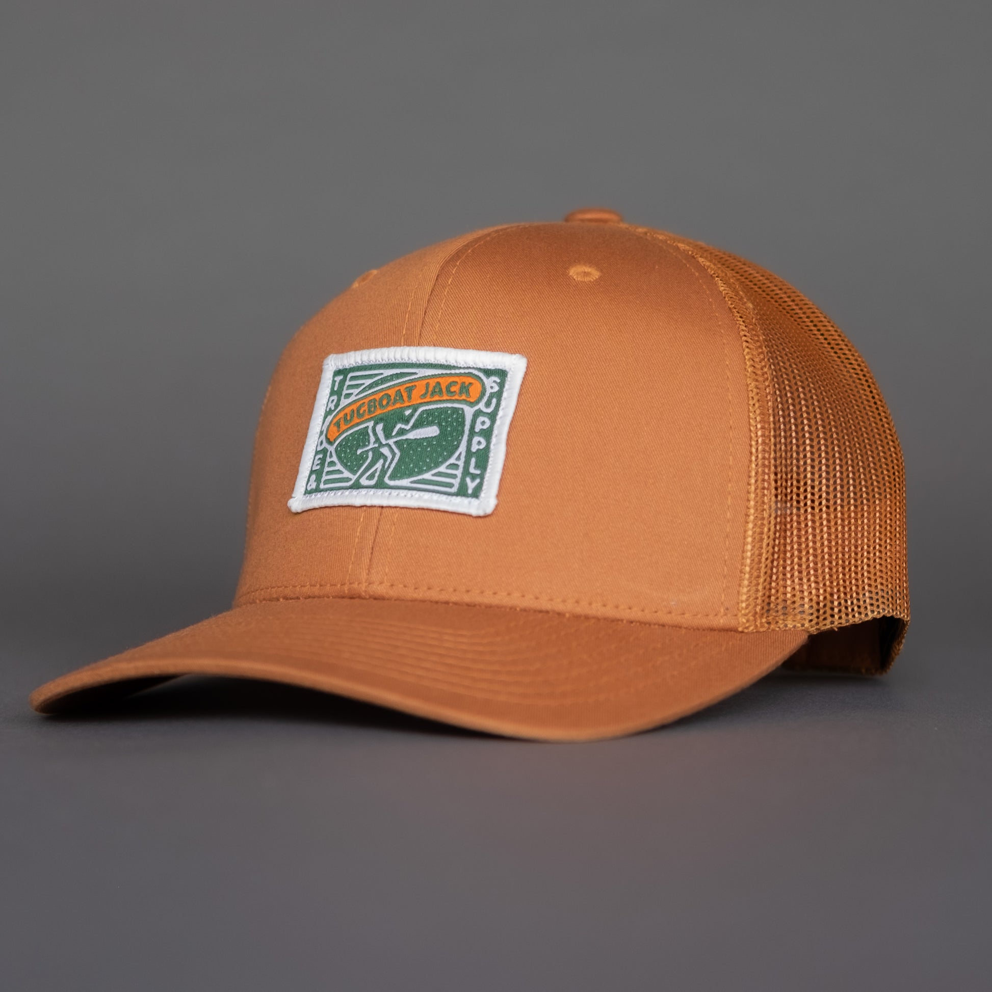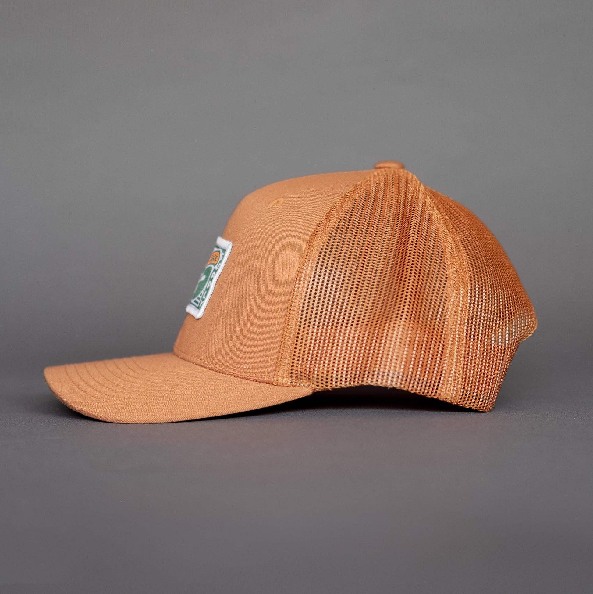 This retro trucker hat is a structured, mid-profile, six-panel snapback with an embroidered patch. The carmel hat is 65/35 polyester/cotton.