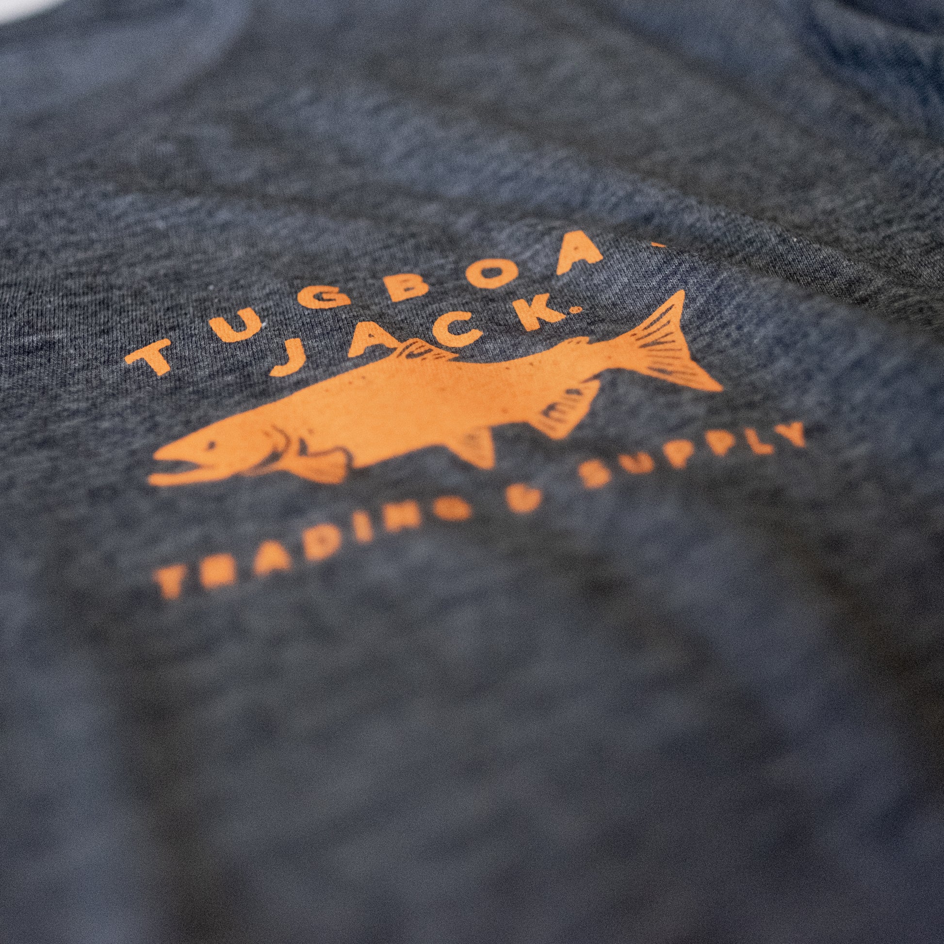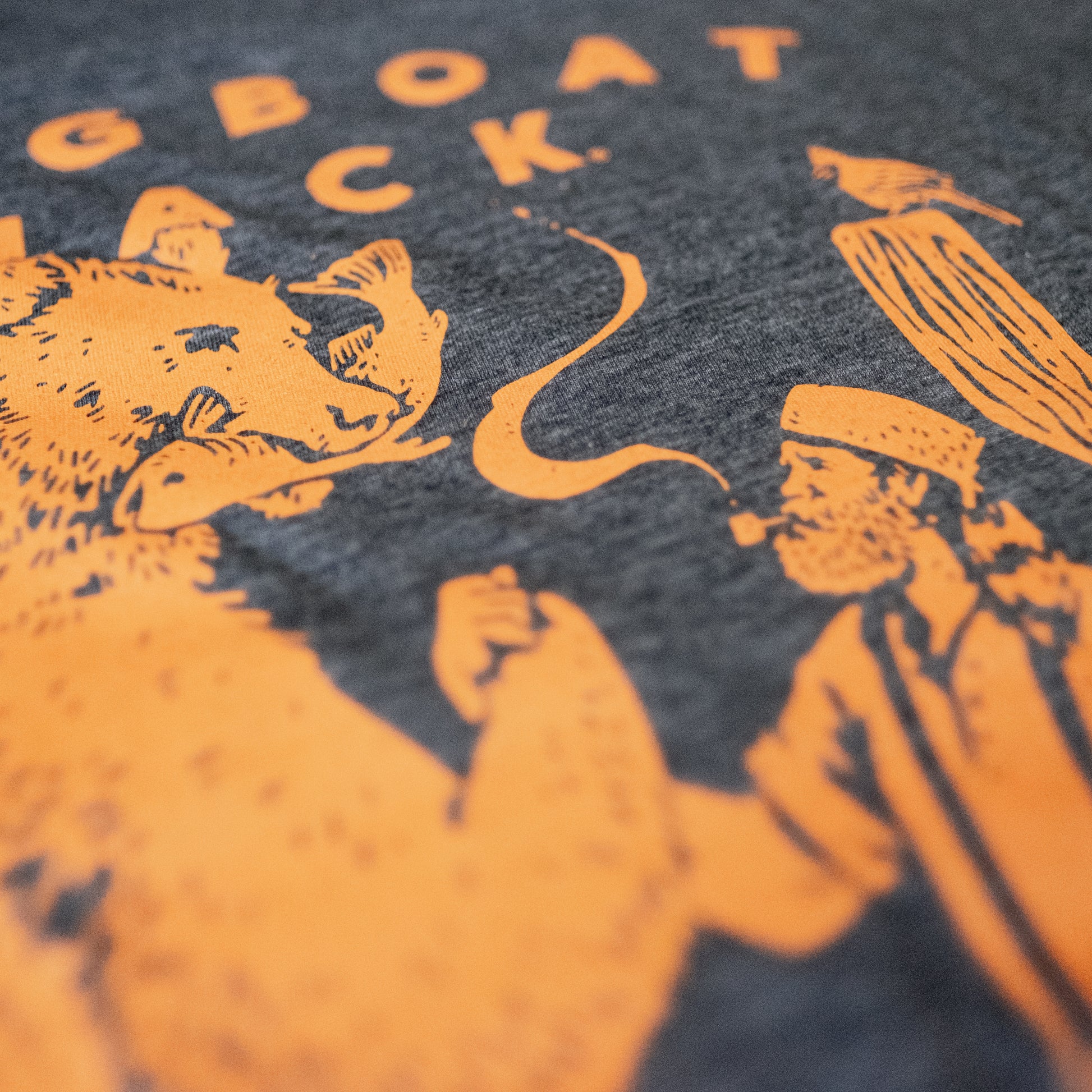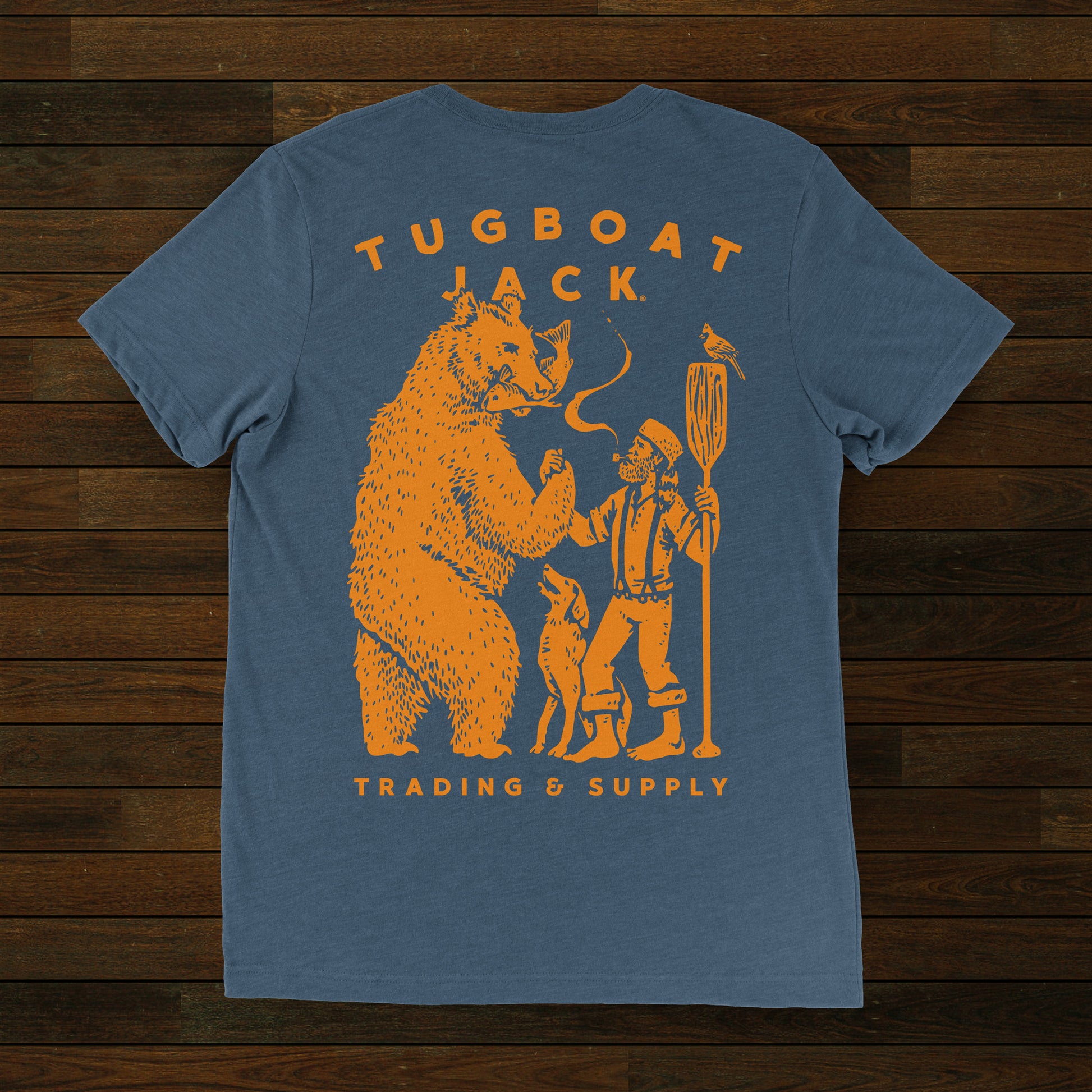 Printed on a unisex vintage blue, super-soft blended tee (65/35 polyester/combed ringspun cotton)with a heavy heathered texture.
