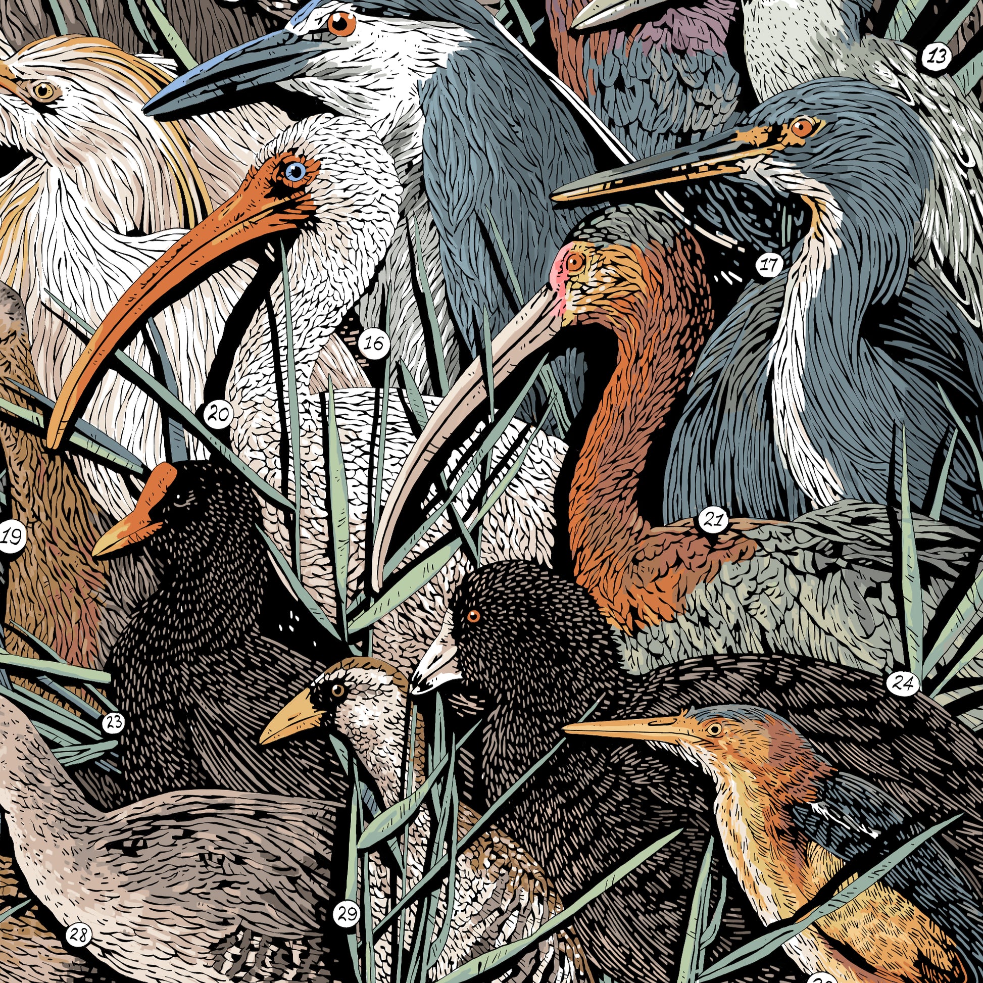 This print of the 31 native wading bird species of North America is hand illustrated and printed on 175 gsm fine art paper and is available in two sizes.