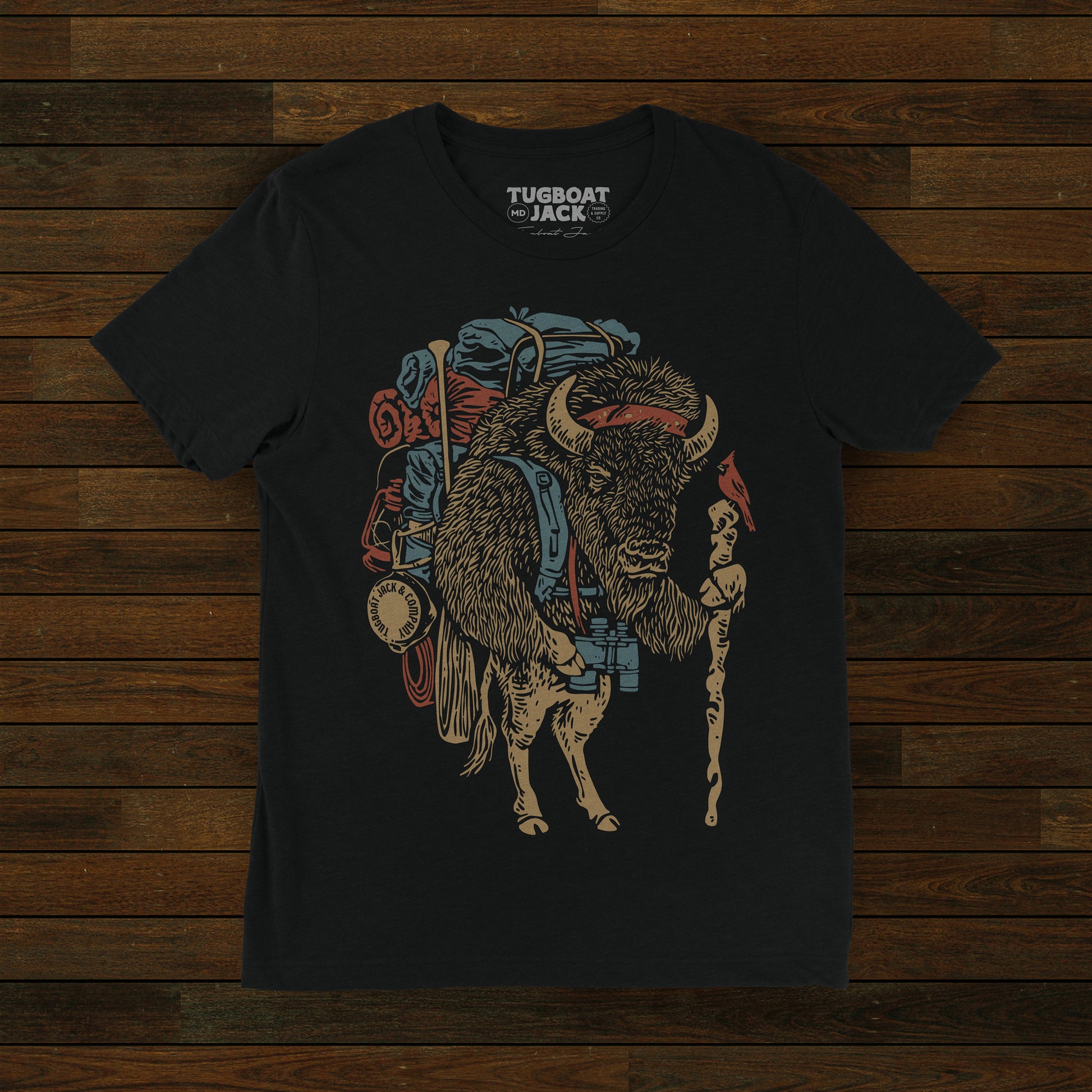 Bring the spirit of the wild frontier to your wardrobe with this "Where the Buffalo Roam" t-shirt, inspired by the classic song that celebrates the vast and untamed wilderness. This design reimagines the iconic buffalo as a true adventurer—fully equipped with camping gear, a walking stick, and a cardinal companion perched on his shoulder. With determination in his eyes and a pack on his back, this buffalo is ready to roam wherever the trail may lead.