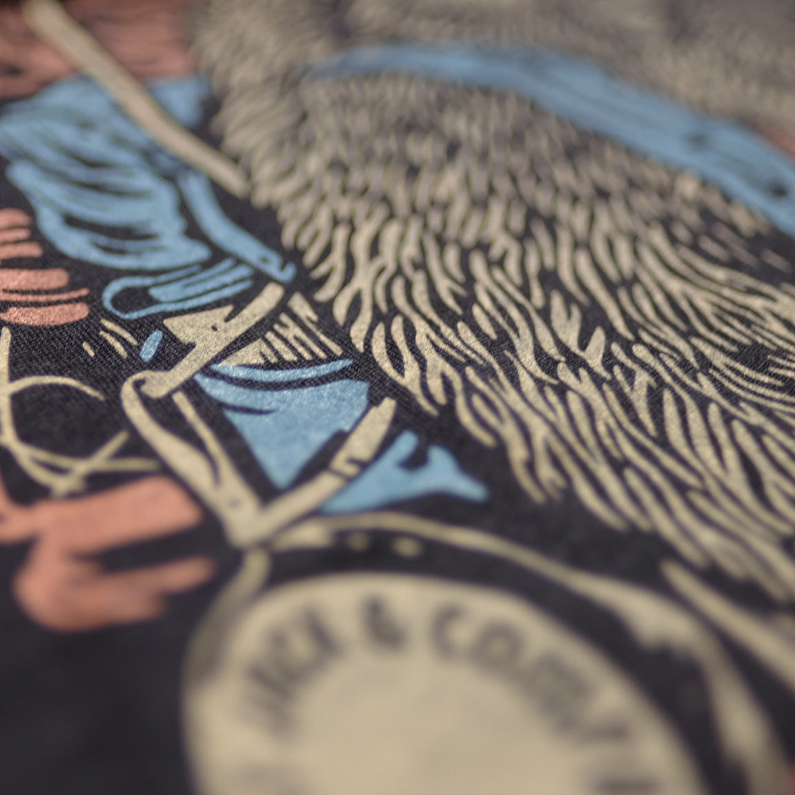 Printed on triblend black unisex tees (50/25/25 polyester/airlume combed and ringspun cotton/rayon). that are softest, coziest shirts in all the land.